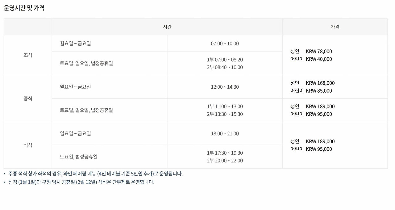 - 주말/공휴일 점심: 성인 189,000원 / 어린이 95,000원