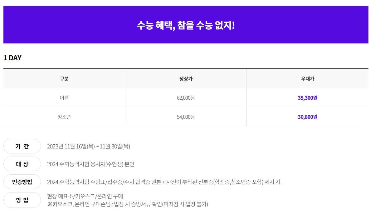 에버랜드도 2024 수능 수험생들을 위한 특별 이벤트를 준비 중입니다. 구체적인 사항은 아직 확정되지 않았지만, 지난해의 사례를 보면 상당한 혜택이 예상됩니다. 작년에는 수험생들에게 최대 약 60%의 특별 가격 우대 혜택을 제공했습니다.